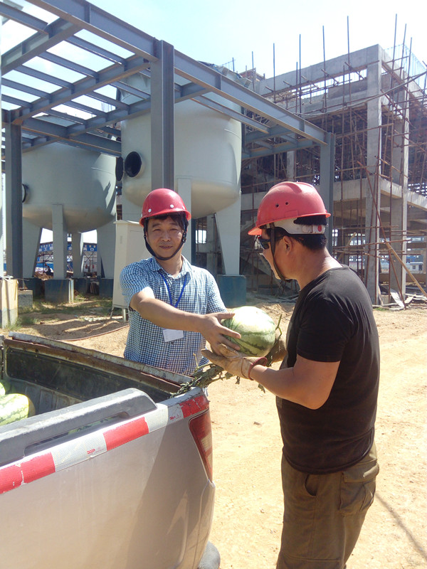 圖為7月18日,公司購買一批西瓜送到工地,相關部門負責人為野外作業(yè)人員送去一片清涼。